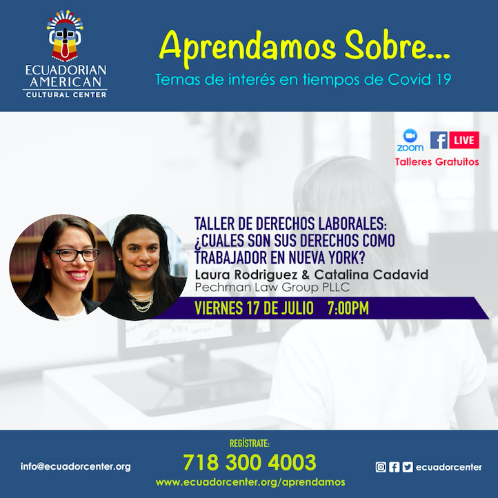 Laura Rodriguez y Catalina Cadavid presentaran un taller para el Centro Cultural Ecuatoriano Americano el 17 de julio titulado, “Taller de Derechos Laborales: ¿Cuales Son Sus Derechos Como Trabajador en Nueva York?” El programa gratuito de seminarios web, que se realizará en espanol, discutirá los derechos legales de los trabajadores en Nueva York. El programa abordará el problema de robos de salarios contra los trabajadores de restaurantes, trabajadores de construcción, trabajadores domésticos, y trabajadores en otras industrias. Dará información de lo que los trabajadores pueden hacer para asegurar que les paguen el salario mínimo adecuado y el pago de horas extras. También discutirán de los derechos de trabajadores Latinx que son víctimas de discriminación racial o acoso sexual.